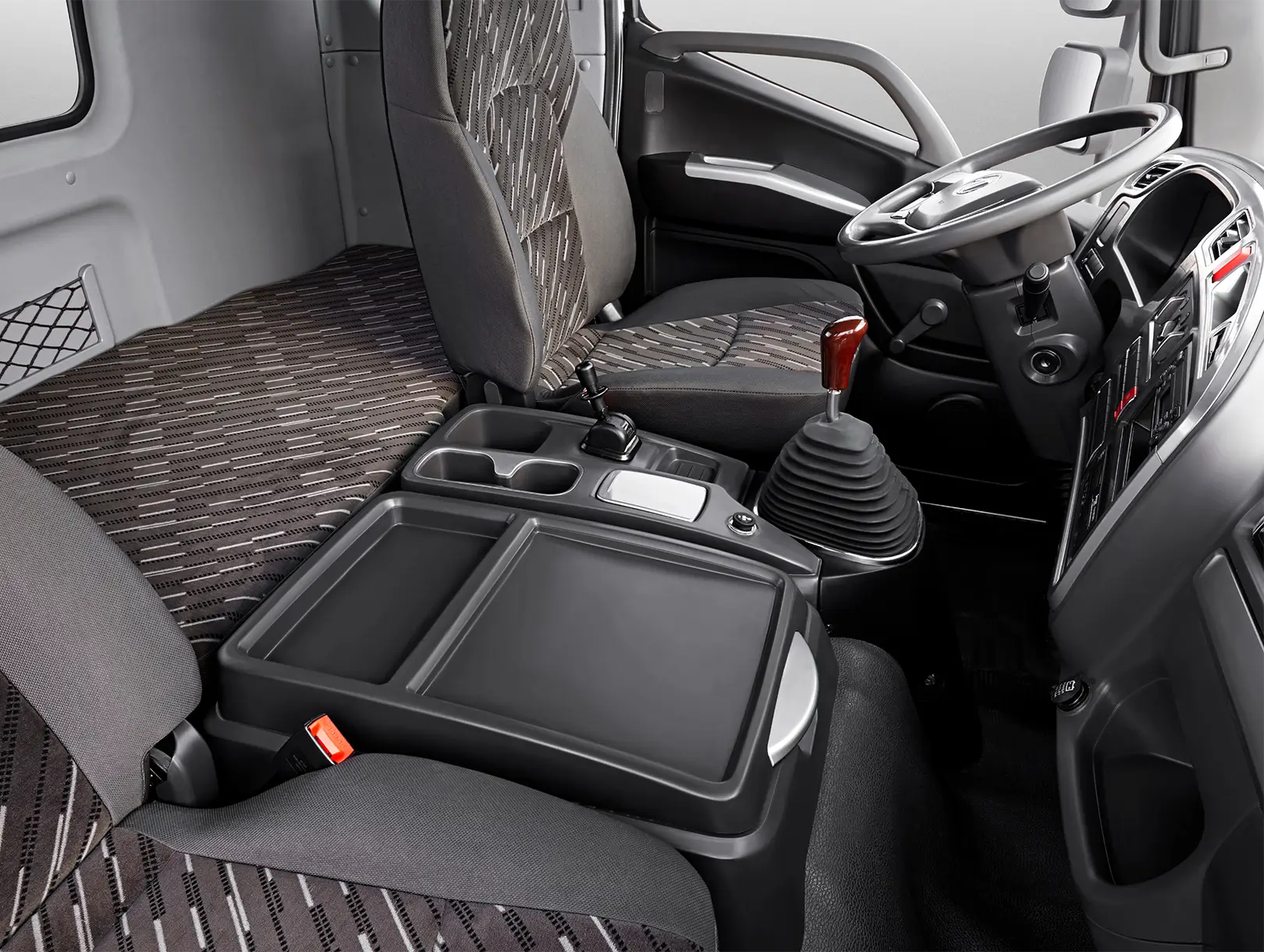 Cabina moderna con parrilla cromada, faros de alta intensidad y deflector de aire que reduce resistencia. Su estructura semiflotante y volante ajustable ofrecen comodidad sin perder presencia industrial.