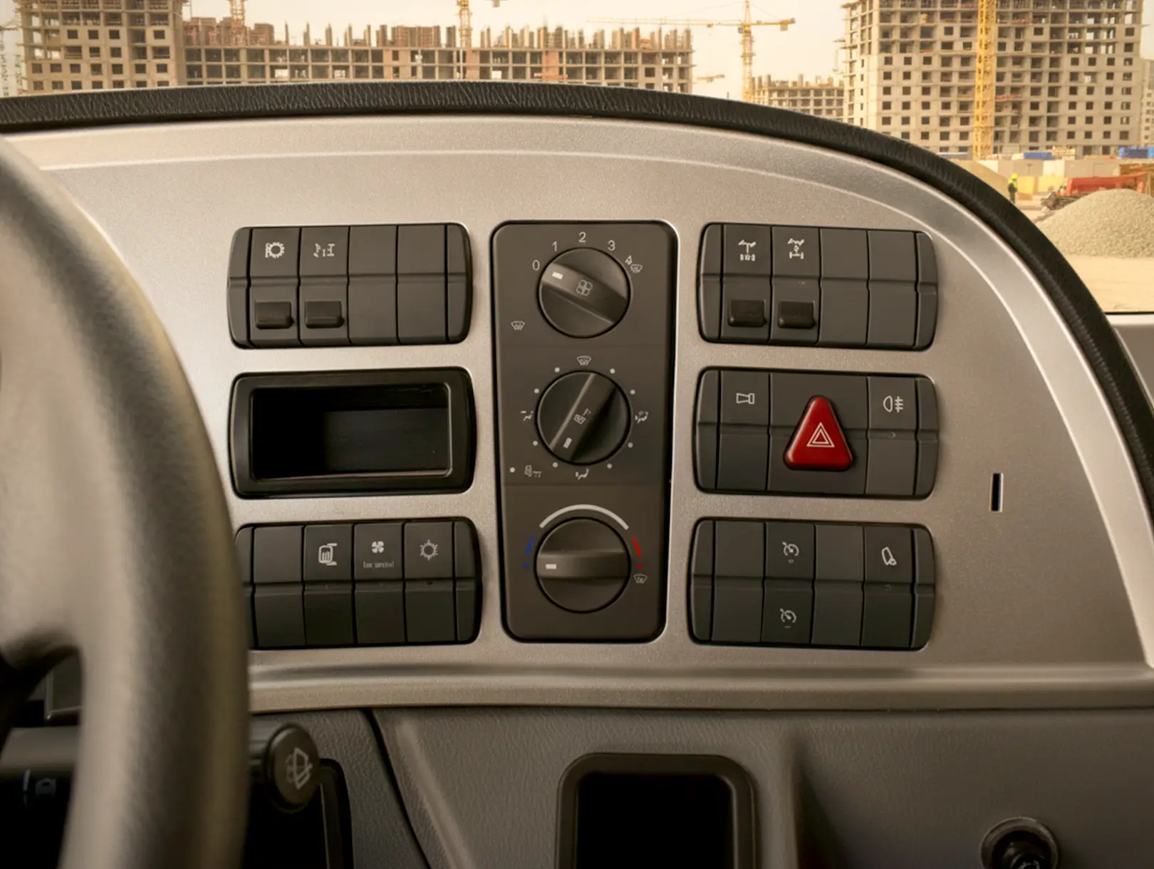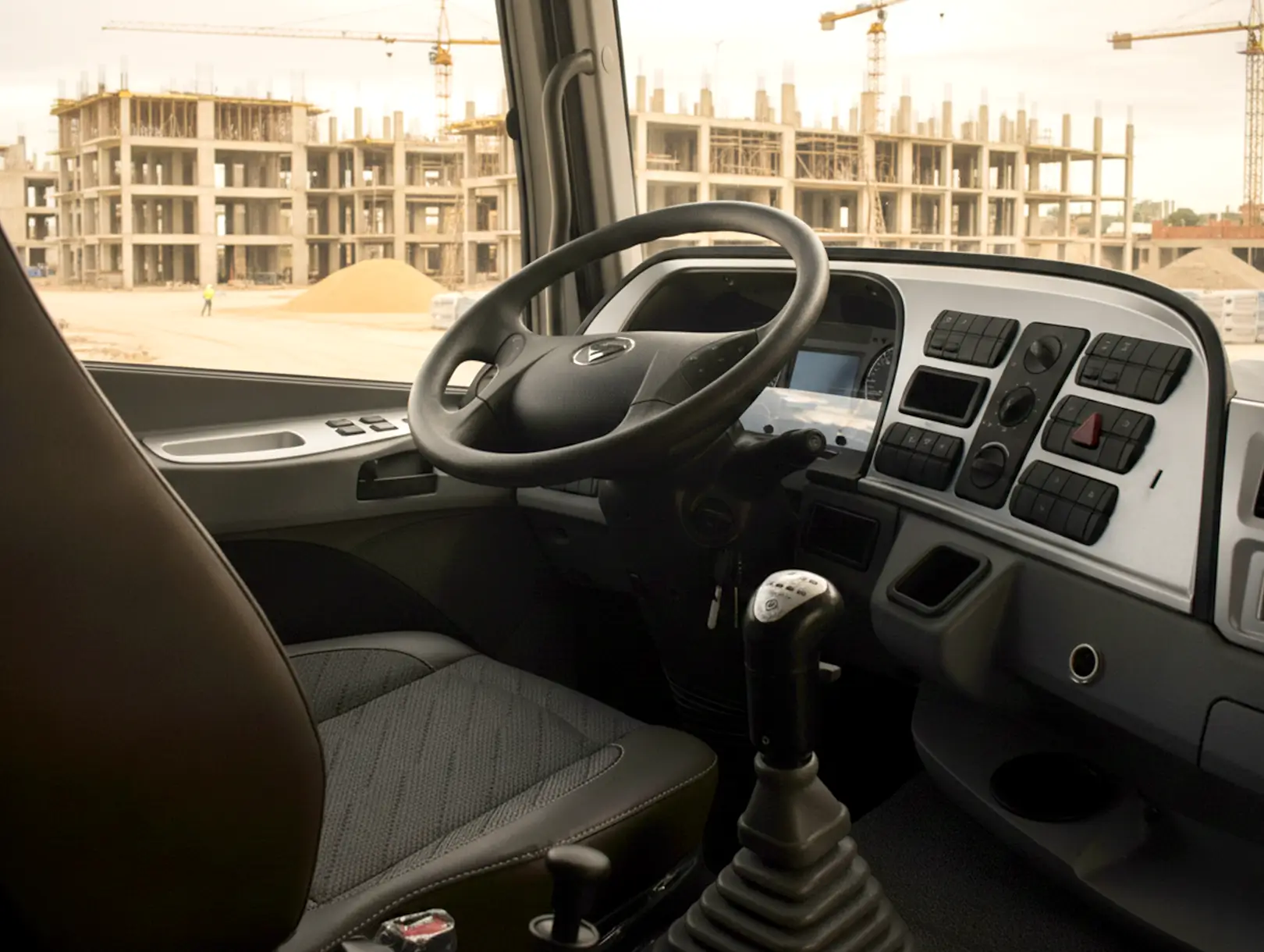 Cabina robusta con gran visibilidad y chasis reforzado. Su proporción 6×4 permite equilibrio entre peso y capacidad. Estilo industrial sólido con acabados de alta durabilidad.